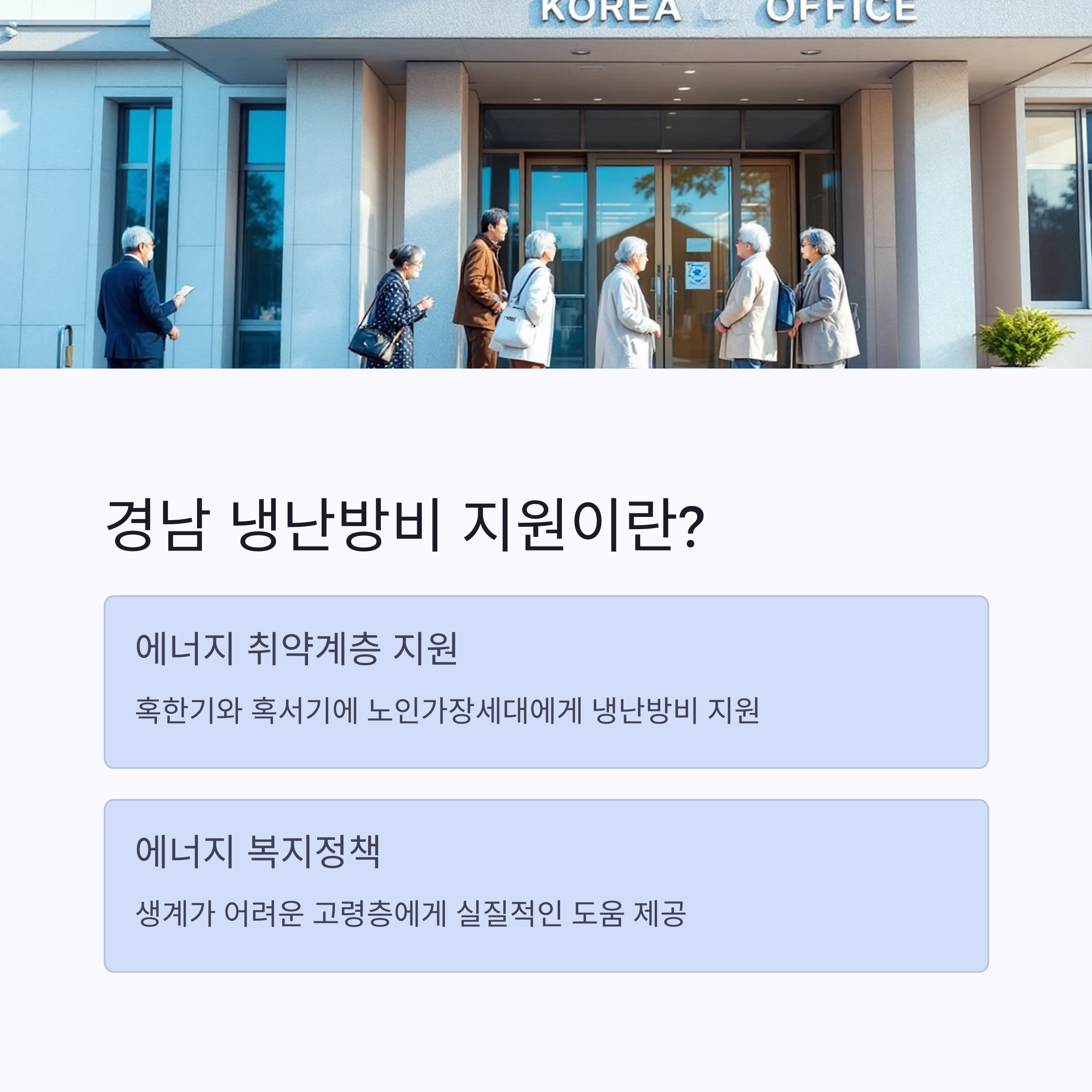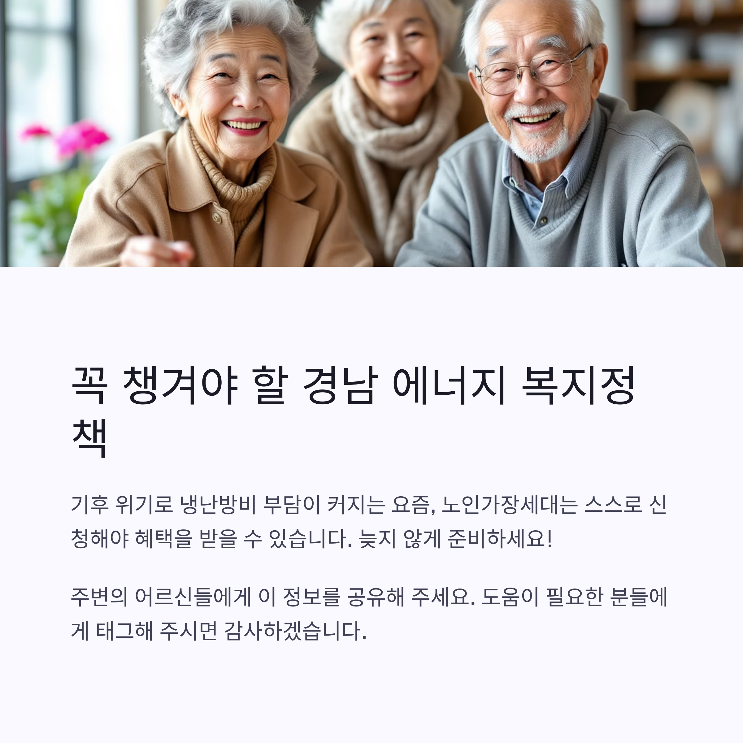 경상남도 및 각 시·군 지자체는 혹한기와 혹서기에 에너지 취약계층, 특히 노인가장세대에게 냉난방비를 지원하고 있습니다. 이는 생계가 어려운 고령층에게 실질적인 도움을 주기 위한 에너지 복지정책의 일환입니다.