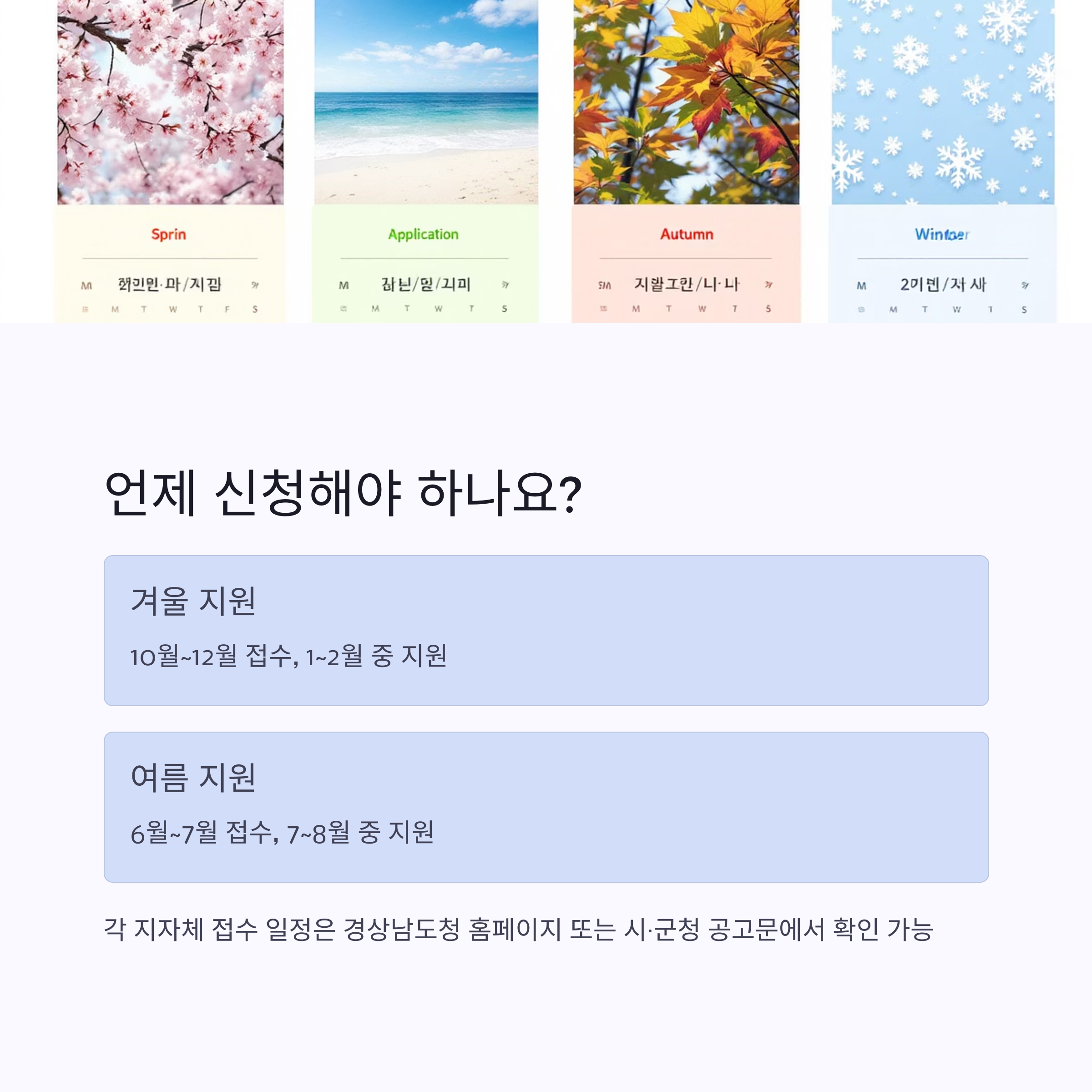 각 지자체의 접수 일정은 경상남도청 홈페이지 또는 시·군청 공고문에서 확인 가능합니다.