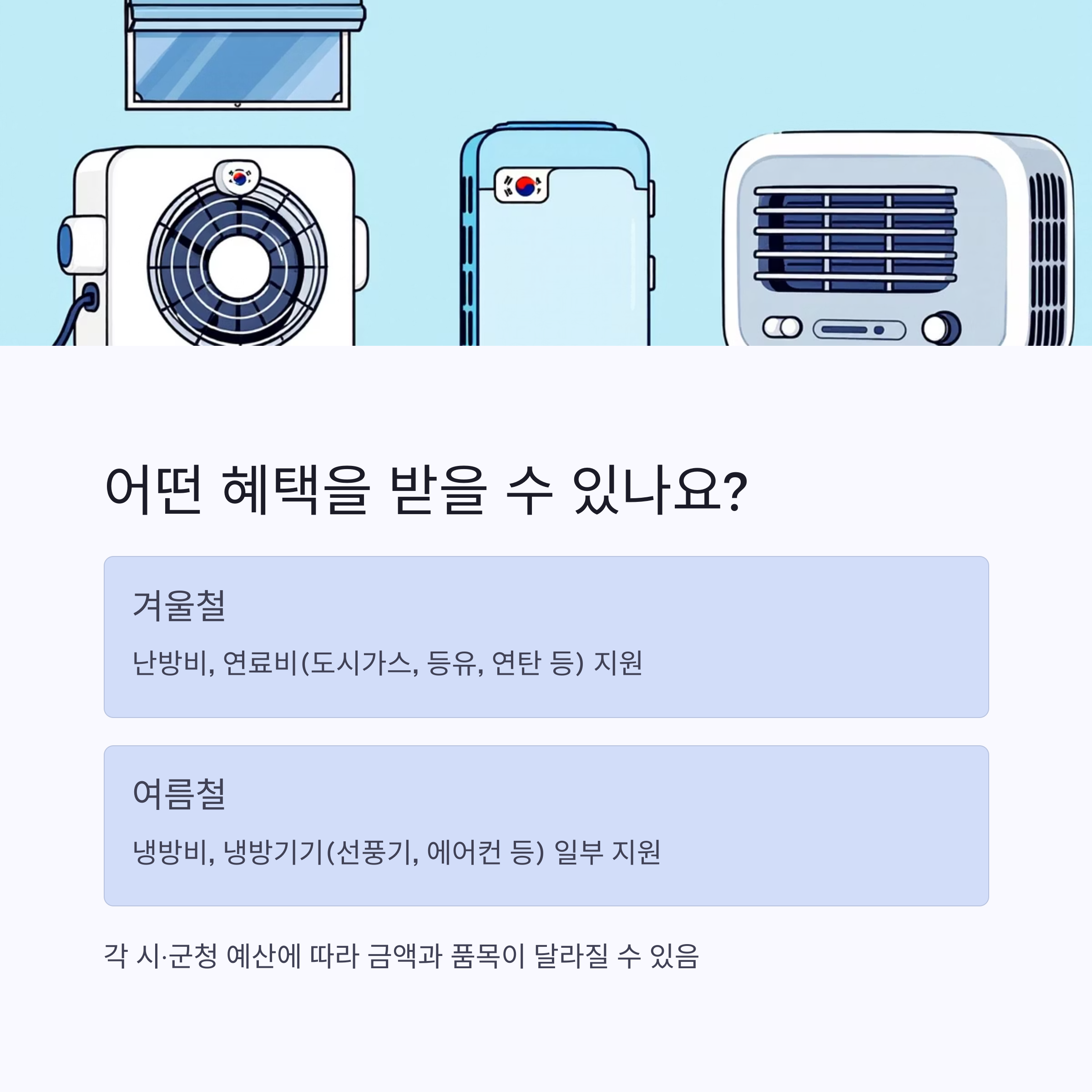 | 여름철 | 냉방비, 냉방기기(선풍기, 에어컨 등) 일부 지원 |