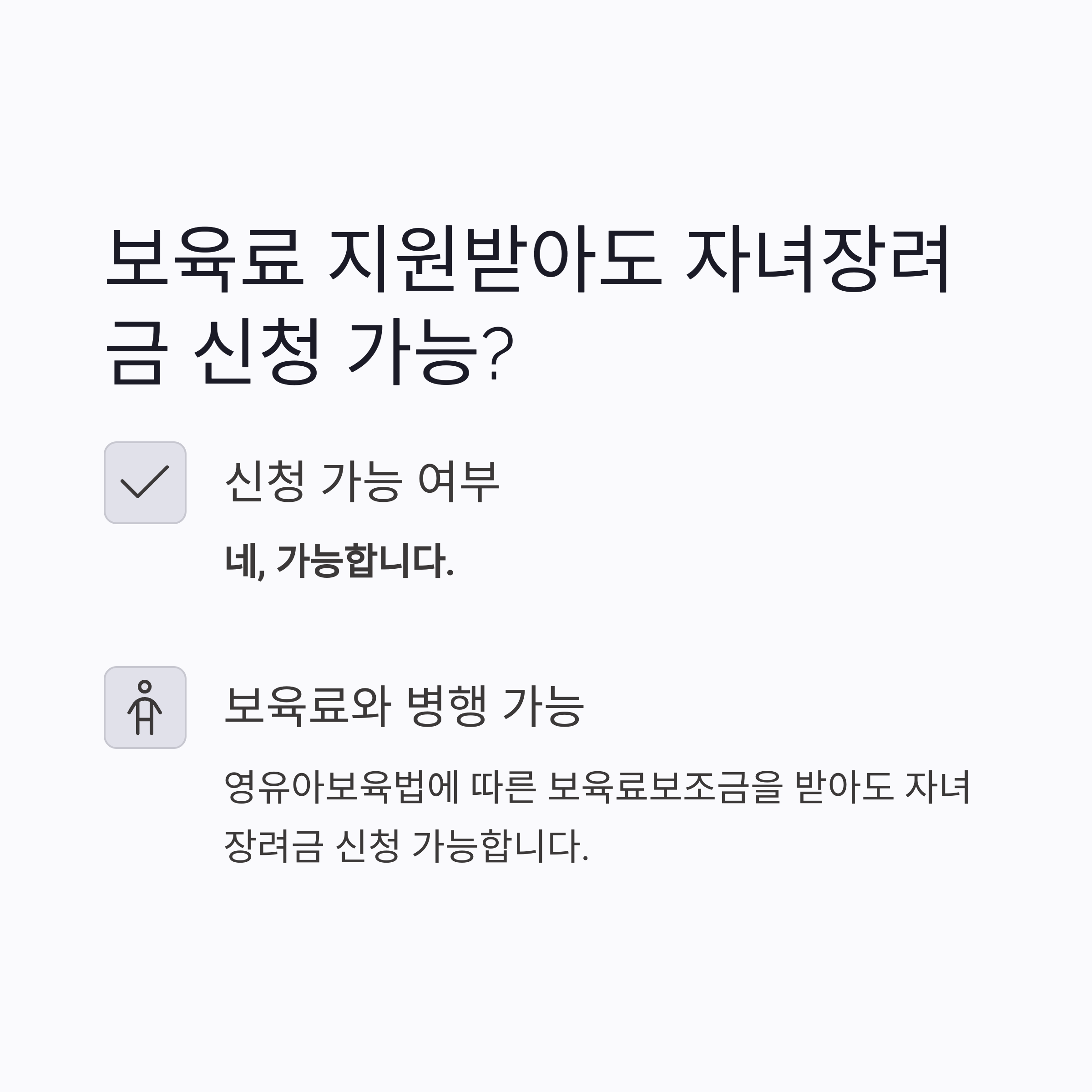 영유아보육법에 따라 보육료보조금을 받는 경우에도 자녀장려금 신청이 가능합니다.