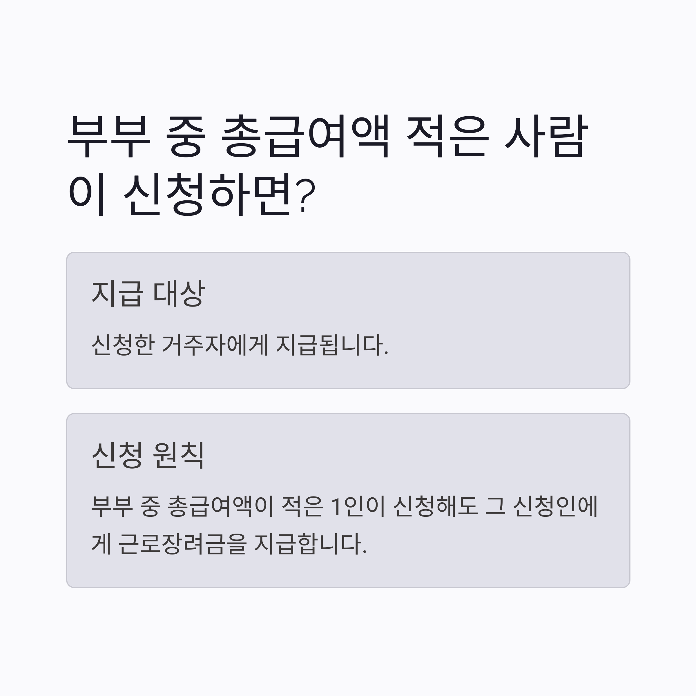 Q10. 부부 중 총급여액등이 적은 1인만 신청한 경우 근로장려금은 누구에게 지급되나요? (총급여액등이 많은 1인은 신청하지 않은 경우를 가정)