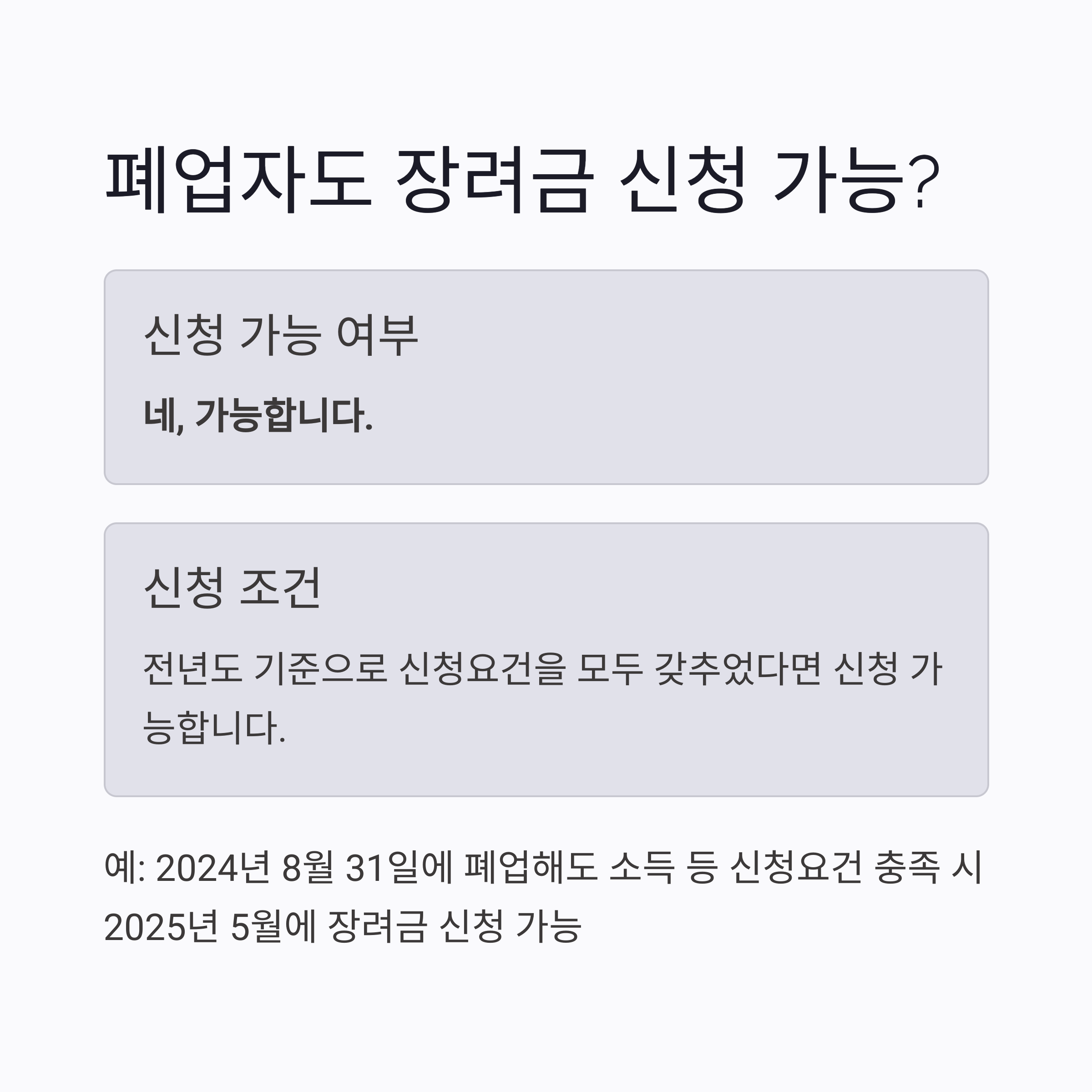 예를 들어, 소매업을 영위하다 2024년 8월 31일에 폐업한 경우에도 소득 등 신청요건을 충족하면 2025년 5월에 장려금을 신청할 수 있습니다.