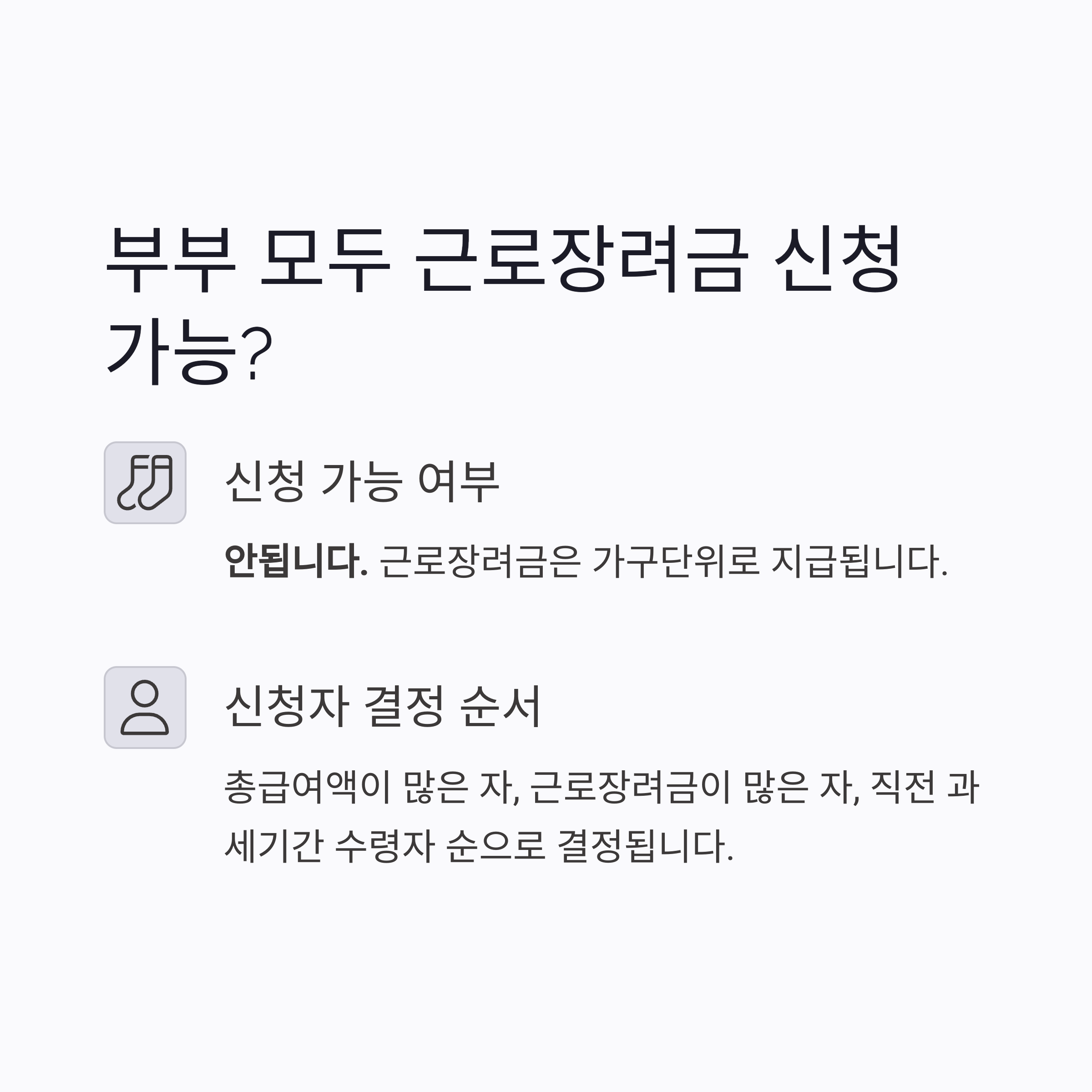 근로장려금은 가구단위로 지급되는 것으로 만약 부부 둘다 근로장려금을 신청한 경우 부부 중 다음의 순서에 따라 정한 거주자 1명이 신청한 것으로 봅니다.
