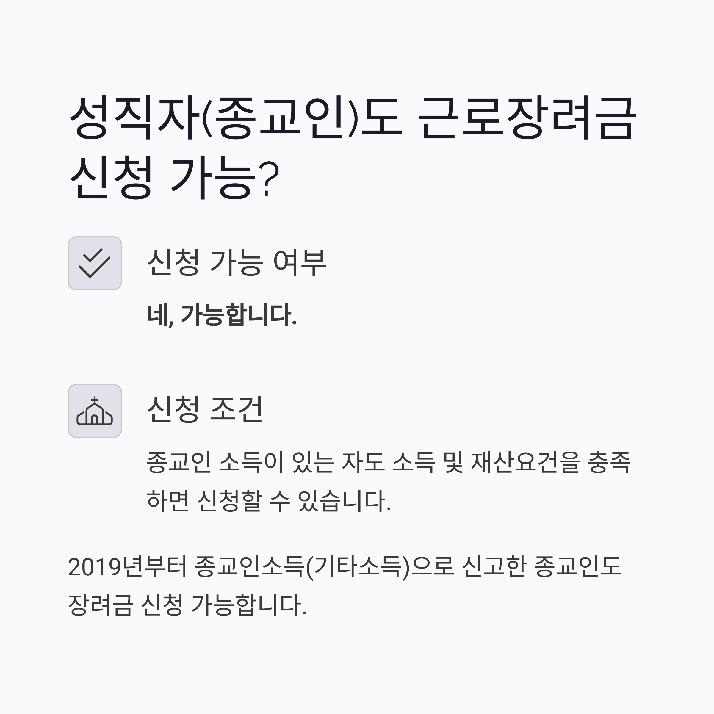 종교인 소득이 있는 자도 소득 및 재산요건을 충족하면 신청할 수 있습니다.
