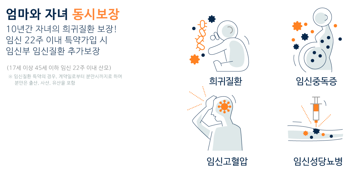 즉, 임신 중 엄마에게 발생할 수 있는 질환(임신중독증, 조산, 고위험 출산 등)은 물론, 아이가 출생 이후 최대 10세까지 발생 가능한 희귀·난치성 질환, 만성질환 등에 대해 보험금 청구가 가능합니다.