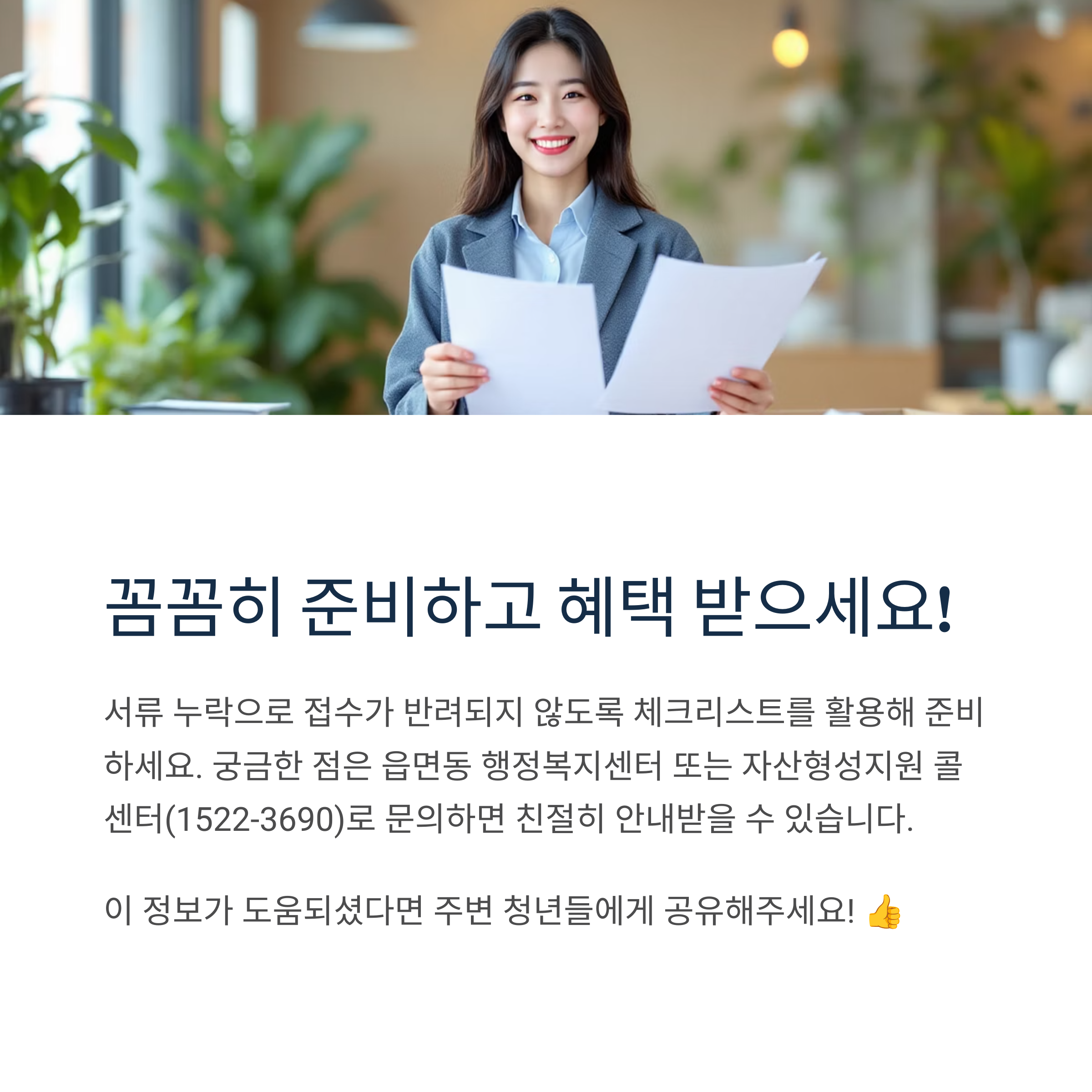 궁금한 점은 가까운 읍면동 행정복지센터 또는 자산형성지원 콜센터(1522-3690)로 문의하면 친절히 안내받을 수 있습니다.