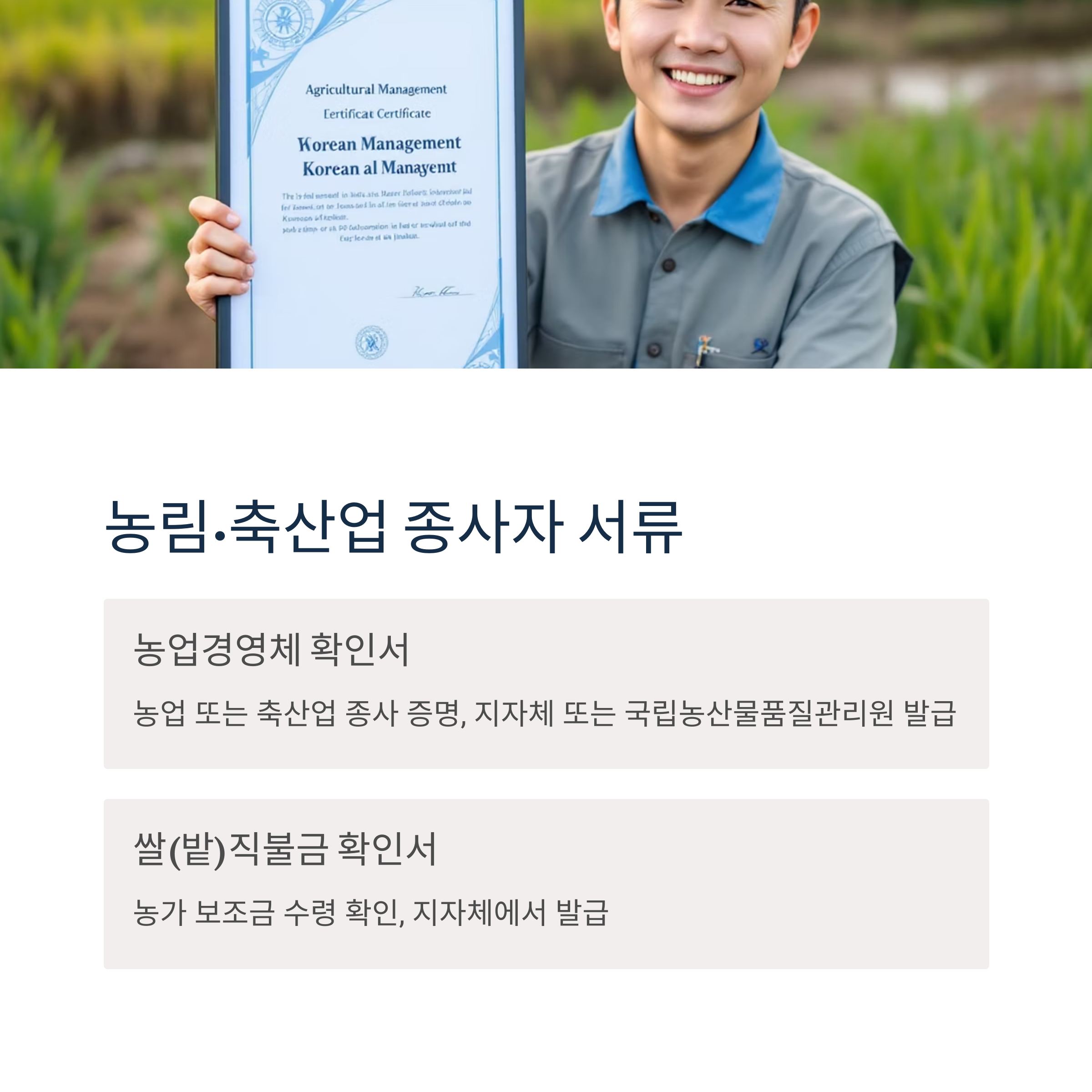 | ⑥ 농업경영체 확인서 | 농업 또는 축산업 종사 증명 | 지자체 또는 국립농산물품질관리원 |