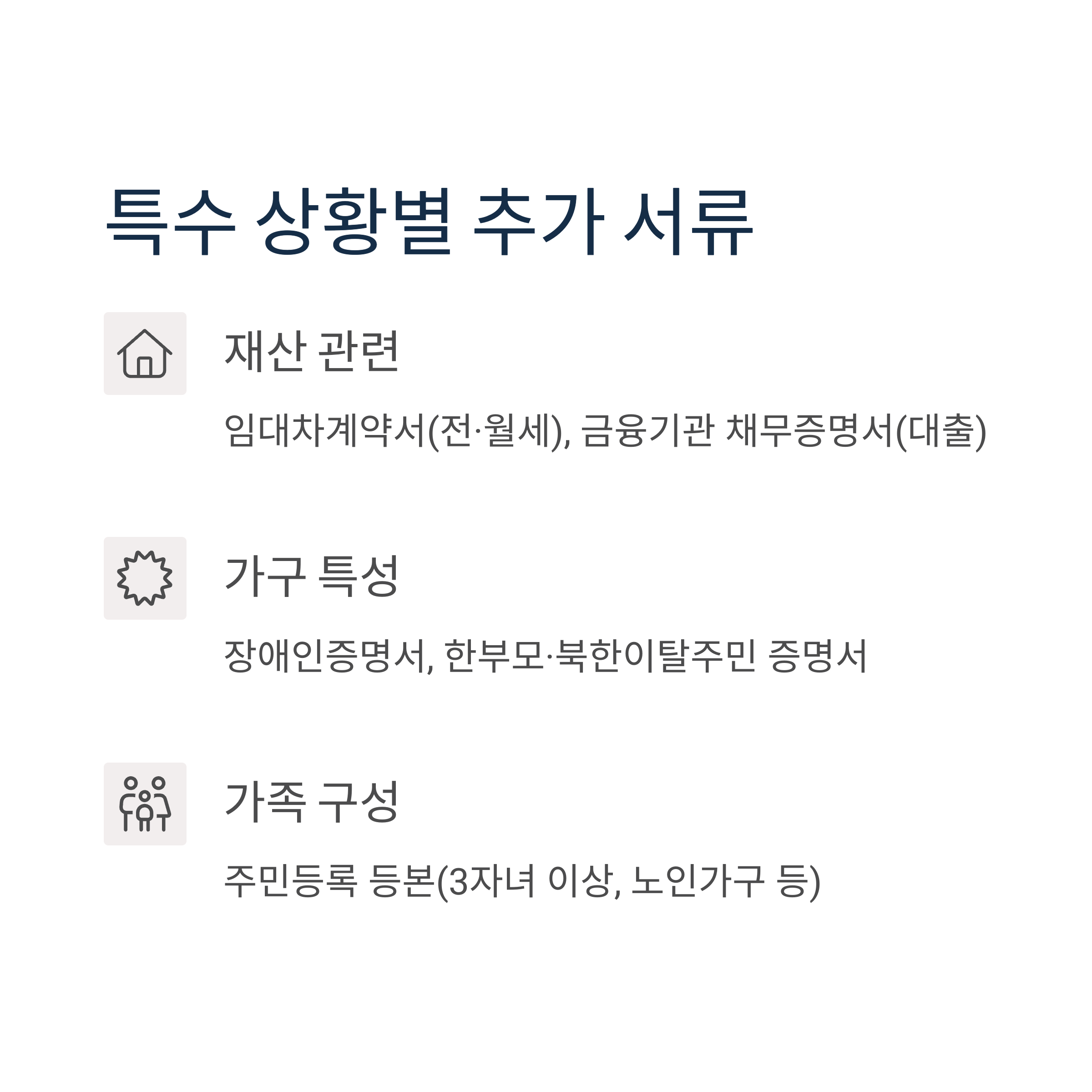 | 기타 | 주민등록 등본 | 3자녀 이상, 노인가구 등 확인 |